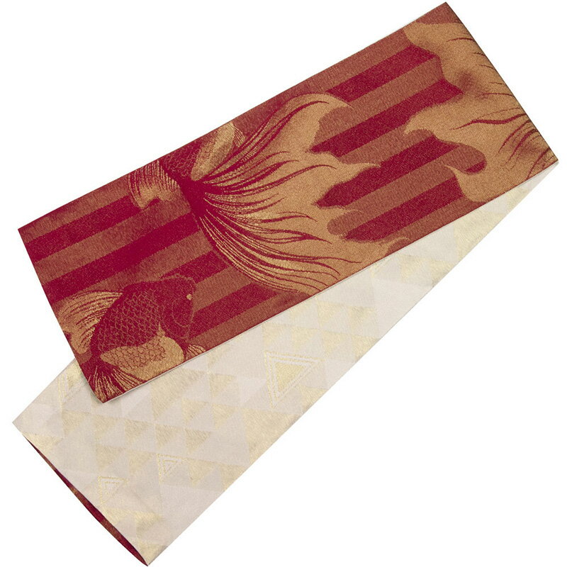 [半幅帯44 京艶哉香(きょうつややか) 金魚柄細帯 エンジ] 半幅帯 リバーシブル 長尺 浴衣 帯 レトロ モダン 金魚 赤 金【ns42】(zr)