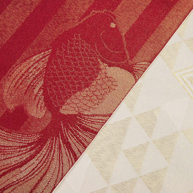 金糸を織り込んだ生地は美しく、帯に施された金魚が光が当たると浮かび上がります。