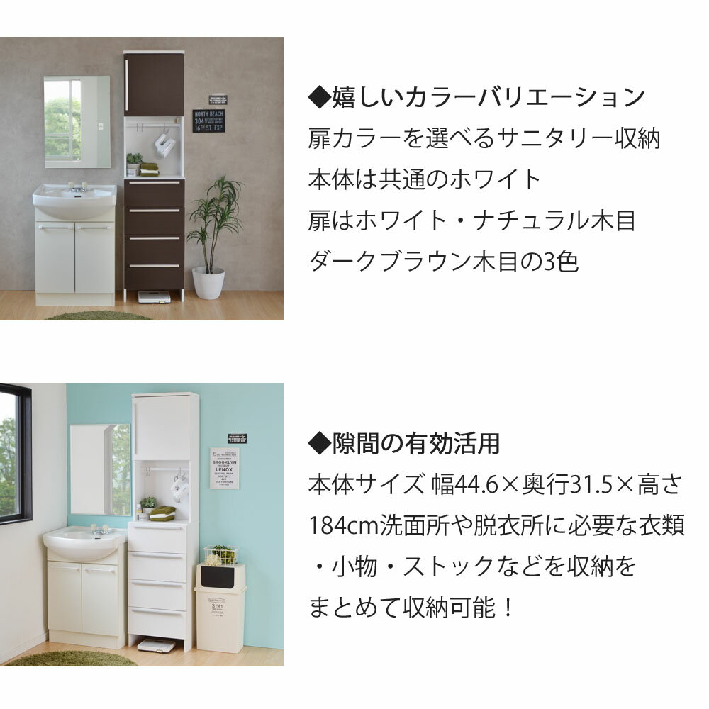 ) 【商品説明】 ◆嬉しいカラーバリエーション 扉カラーを選べるサニタリー収納 本体は共通のホワイト扉はホワイト・ナチュラル木目・ダークブラウン木目の3色 ◆隙間の有効活用 本体サイズ 幅44.6×奥行31.5×高さ184cm 洗面所や脱衣所に必要な衣類・小物・ストックなどを収納をまとめて収納可能! ◆扉内の棚 扉内は移動棚が1枚。
